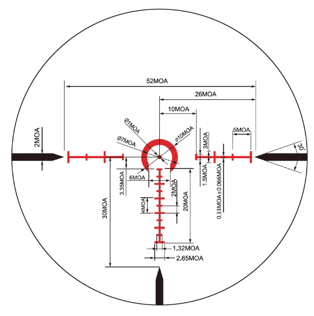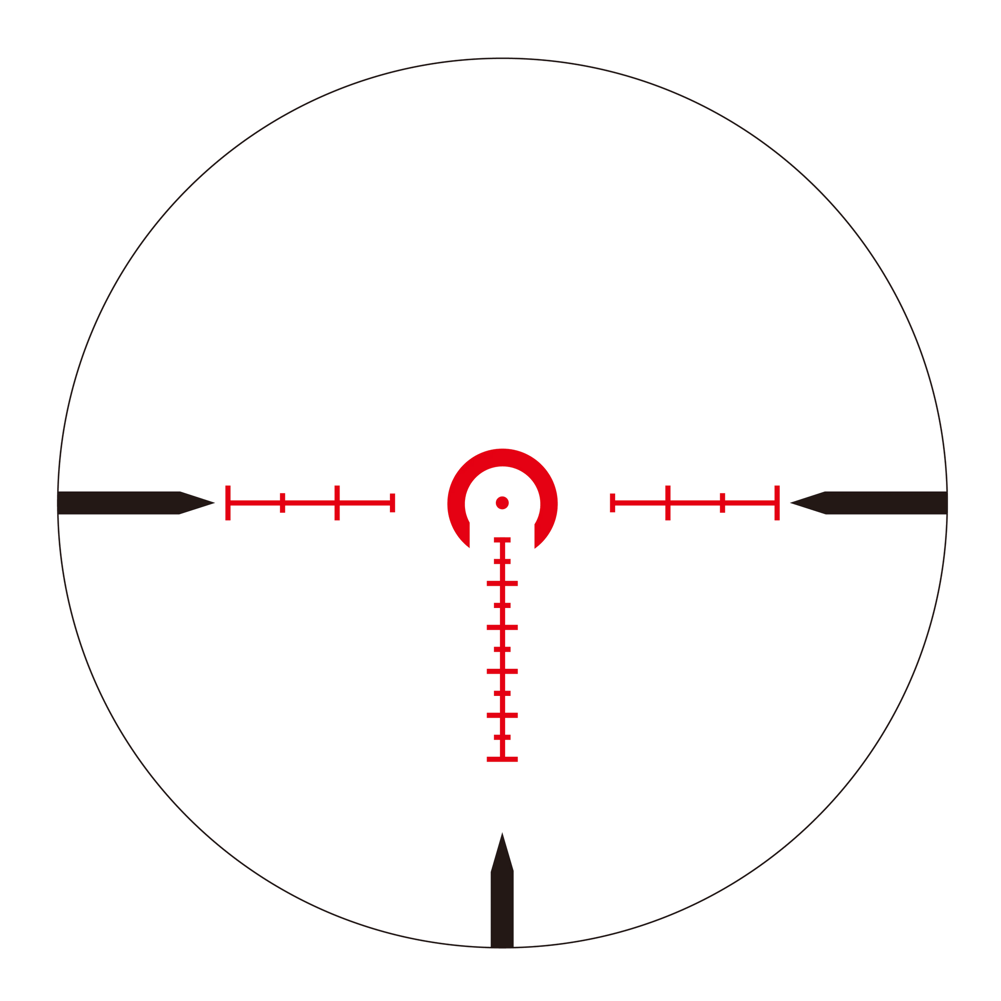 Illuminated BDC Reticle: This horseshoe BDC reticle features a 1 MOA dot surrounded by a 7MOA - 10MOA circle. Choose from 6 brightness settings to optimize your aiming point in various lighting conditions, from bright daylight to low-light scenarios.