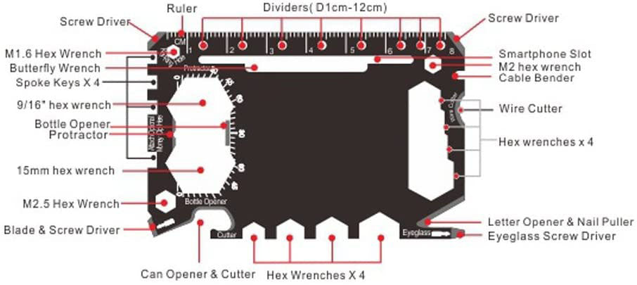 43 Functions: 3x Screw Drivers, Box Cutter/ Blade, Bottle Opener, 2x Ruler (cm/in), Can Opener, Cell Phone Mount, Nail Puller, Eye Glasses Screw Driver, M2 Hex Wrench, 4x Open Hex Wrench (M3,M4,M5,M6), 4x Closed Hex Wrench (7/16, 3/8, 11/32, 5/16), M1.6 Hex Wrench, Butterfly Wrench, 4x Spoke Keys (.127, .130, .136, .156), 9/16" Hex Wrench, Protractor, 15mm Hex Wrench, M2.5 Hex Wrench, 8x Dividers (D1cm-12cm), Key Ring hole, Money clip and more