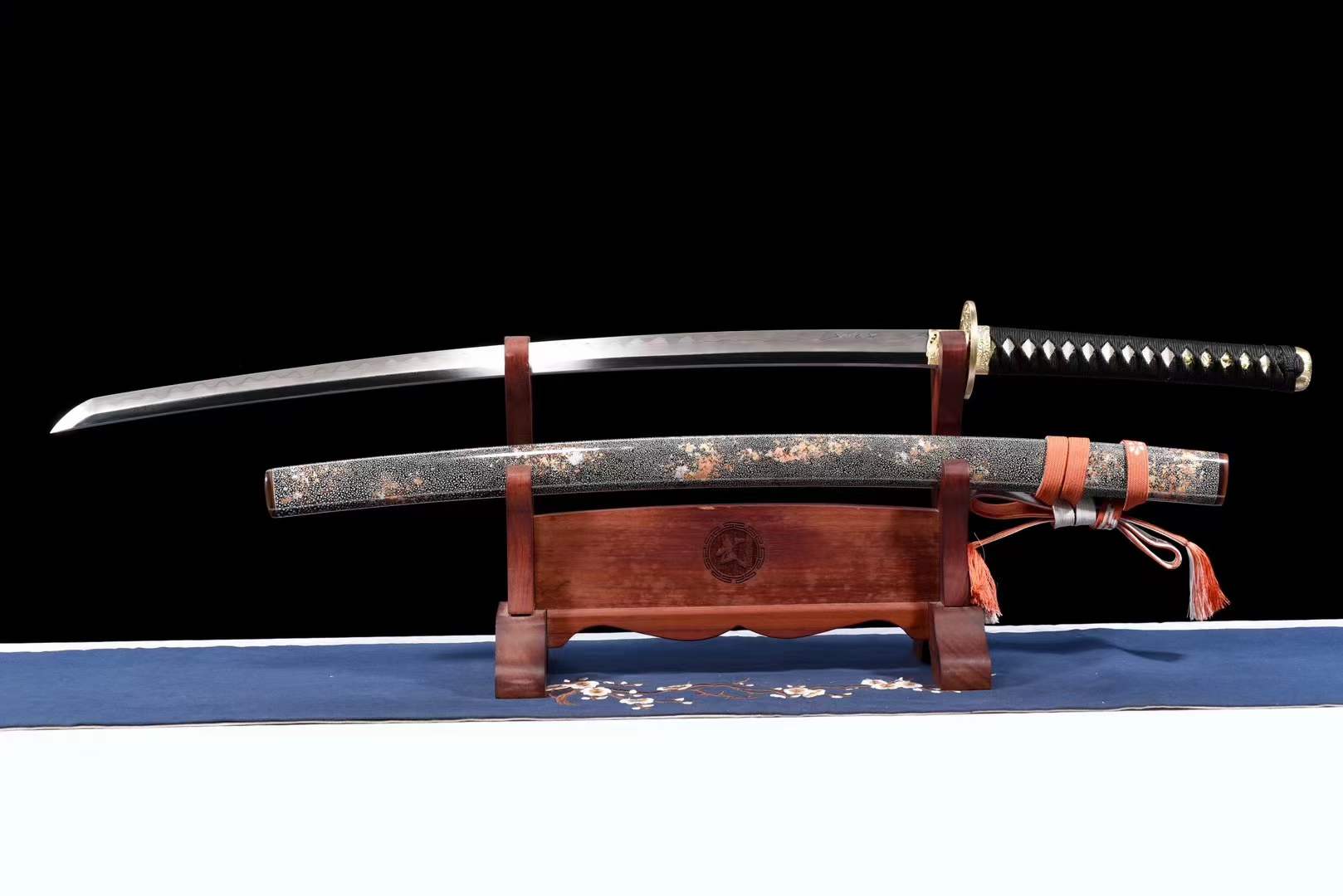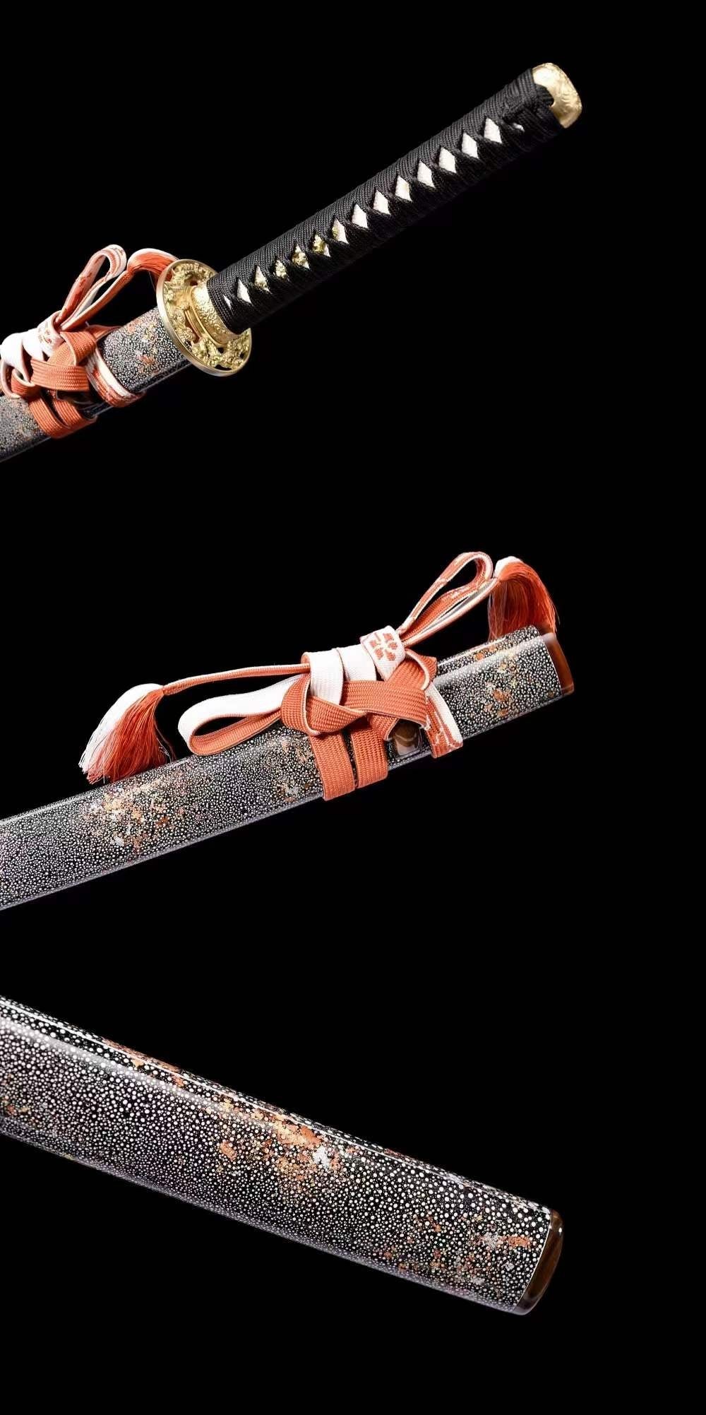 Saya Material: | The scabbard is made of blue skin wood with an imitation fish skin lacquer (koiguchi, kojiri, and kurikata are all inlaid with yellow ox horn), paired with a finely crafted Japanese silk cord wrapping. |