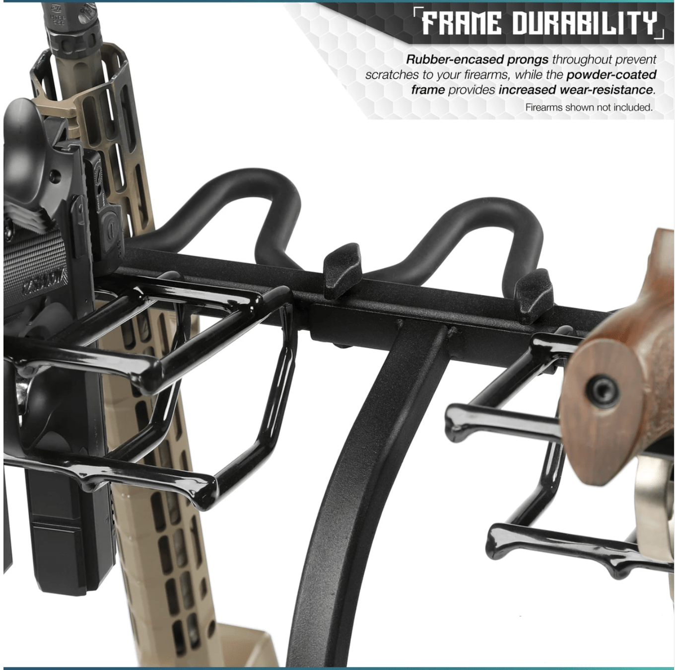 Upgraded Base for Extra Stability: Designed with an improved base for enhanced rigidity and stability, this stand keeps your valuable firearms upright and protected, even when fully loaded. Rubber-encased prongs prevent scratches and help keep your rifles and pistols securely in place.